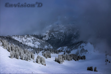 This place definitely has a big mountain, Snowbird/ Jackson Hole/ Big Sky type feel terrain wise. The snow, though, is wetter and heavier than what you'll see in Utah, Montana, or Wyoming. Also, there are only a couple of restaurants and hotels to choose from here at the resort, although the base village is brand new and beautiful.